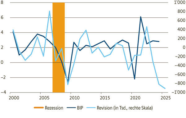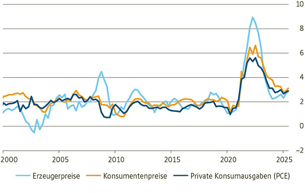 - Die Schweizer Konjunktur litt bereits in der ersten Jahreshälfte unter der Anhebung der US-Zölle. In den kommenden Quartalen wird das Wachstum von der US-Handelspolitik geprägt bleiben. Wir erwarten 2025 ein leicht tieferes Wachstum von 1,2% und für 2026 von 0,8%. Dabei belastet v.a. der Aussenhandel, während der Konsum die konjunkturelle Stütze bleibt. Die Inflation dürfte dieses Jahr wegen der Frankenstärke nur unwesentlich über 0% zu liegen kommen.