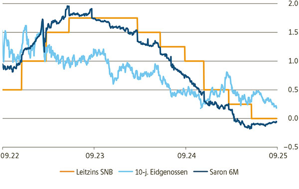 Schweiz: SNB-Leitzins, Saron 6 Monate und Rendite 10-j. Eidgenossen (3 Jahre)