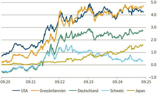 - Aktuell liegen die Renditen für 10-jährige Staatsanleihen in den USA bei 4,2%, in Deutschland bei 2,75% und in der Schweiz bei 0,2%. Diese Niveaus sind insofern erstaunlich, als man aufgrund der sich verschlechternden Situation mit der zunehmenden Staatsverschuldung höhere Renditen erwarten würde.