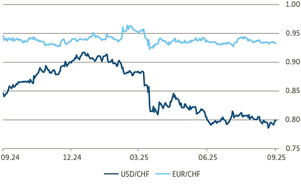 - Mittelfristig gehen wir von weiter sinkenden USD-Kursen aus. Das Ausmass des Vertrauensverlustes in Weltwährung nimmt aufgrund der aggressiven Handelspolitik der USA und der verbalen Angriffe auf die Unabhängigkeit der US-Notenbank zu.