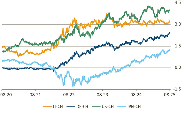 - Seit der Aufgabe der Nullzinspolitik der Bank of Japan und der Lockerung – aber nicht der vollständigen Aufgabe – der Zinskurvenkontrolle, also die direkte Einflussnahme auf die langlaufenden Anleihen, steigt der Zinsaufschlag der japanischen Anleihen gegenüber den Schweizer Papieren am deutlichsten an. Die hohe Verschuldung Japans sowie die stark negativen Realzinsen stehen im Widerspruch mit der Realität. Die enttäuschende Nachfrage der letzten Emissionen ist ein klares Zeichen, dass der Markt höhere Renditen fordert.