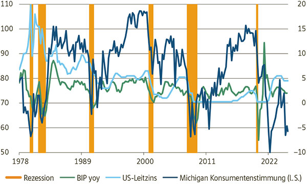 USA: Wachstum, Leitzins, Stimmung und Rezessionsphasen (seit 1978)