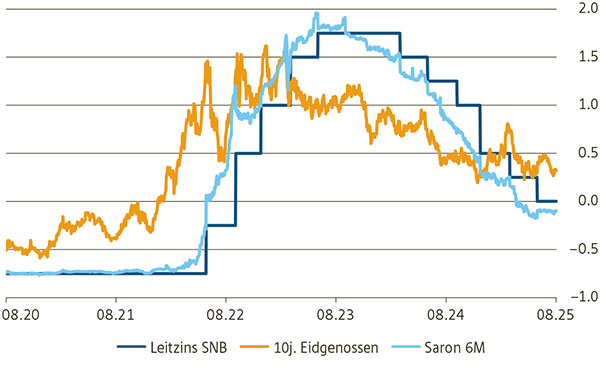 Schweiz: SNB-Leitzins, Saron 6 Monate und Rendite 10-j. Govis (5 Jahre)