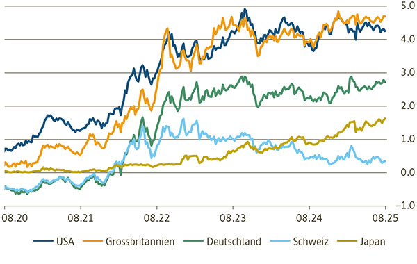 - Aktuell liegen die Renditen für 10-jährige Staatsanleihen in den USA bei 4,3%, in Deutschland bei 2,7% und in der Schweiz bei 0,3%. In Japan sind diese Sätze seit 2008 erstmals wieder auf über 1,6% gestiegen.