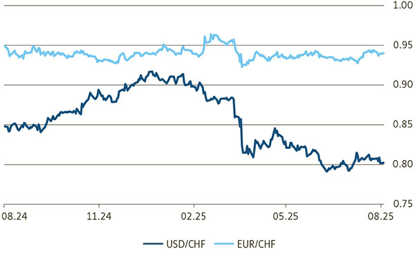 - Zum Schweizer Franken hat der US-Dollar im Laufe des Jahres rund 12 Prozent verloren und bewegt sich nun um die Marke von 0,80. Solche Niveaus wurden zuletzt während der Euro-Krise 2011 und nach der Aufhebung der Euro-Anbindung durch die SNB im Januar 2015 verzeichnet. Dies unterstreicht den Nimbus des Frankens als sicherer Hafen und verdeutlicht zugleich das Ausmass des Vertrauensverlustes in den Dollar. Haupttreiber sind die aggressive Handelspolitik der USA und die verbalen Angriffe auf die Unabhängigkeit der US-Notenbank, welche die Verunsicherung zusätzlich verstärken. Zwar ist kurzfristig eine technische Erholung denkbar, mittelfristig dürfte die Dollar-Schwäche jedoch anhalten.