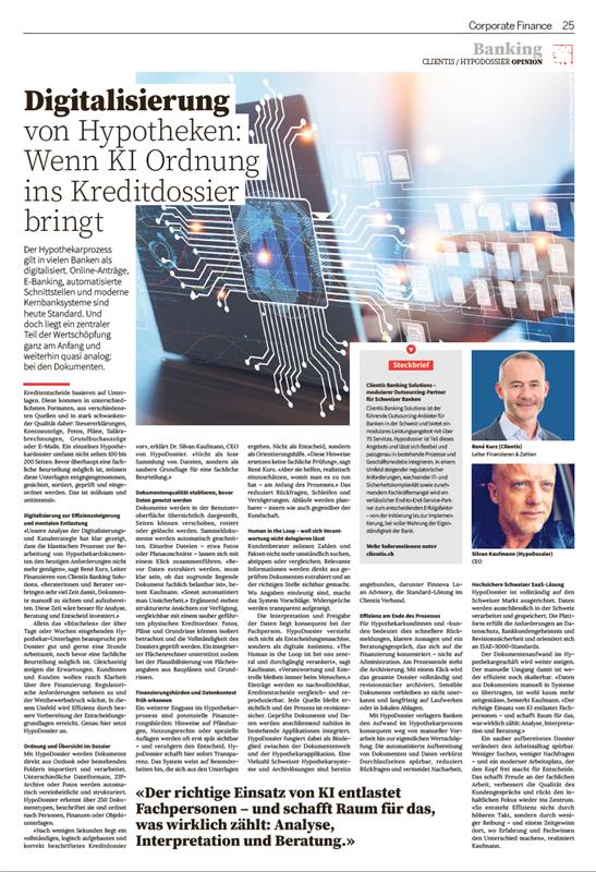 In der aktuellen Handelszeitung-Beilage Corporate Finance vom Januar 2026 zeigt Clientis Banking Solutions gemeinsam mit HypoDossier, wie moderne Technologien und der gezielte Einsatz von KI das Hypothekargeschäft vereinfachen. Der Beitrag veranschaulicht praxisnah, wie Banken Komplexität reduzieren, Prozesse optimieren und mehr Zeit für ihre Kundinnen und Kunden gewinnen.
