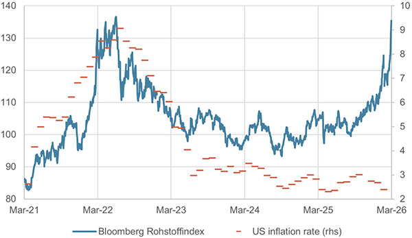 Bloomberg Rohstoffindex und US-Inflationsrate in %